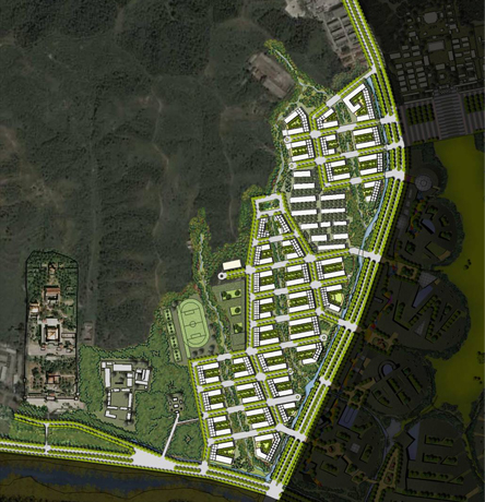 將開(kāi)發(fā)隱藏在成片的綠林后, 保留區(qū)內(nèi)谷地沖溝,設(shè)置低強(qiáng)度、高品質(zhì)的溪畔院落型的分時(shí)度假村。